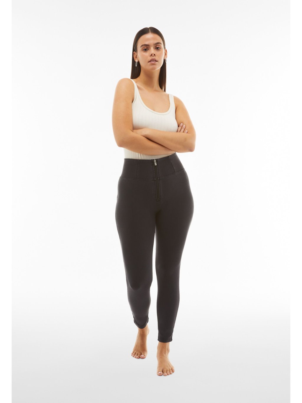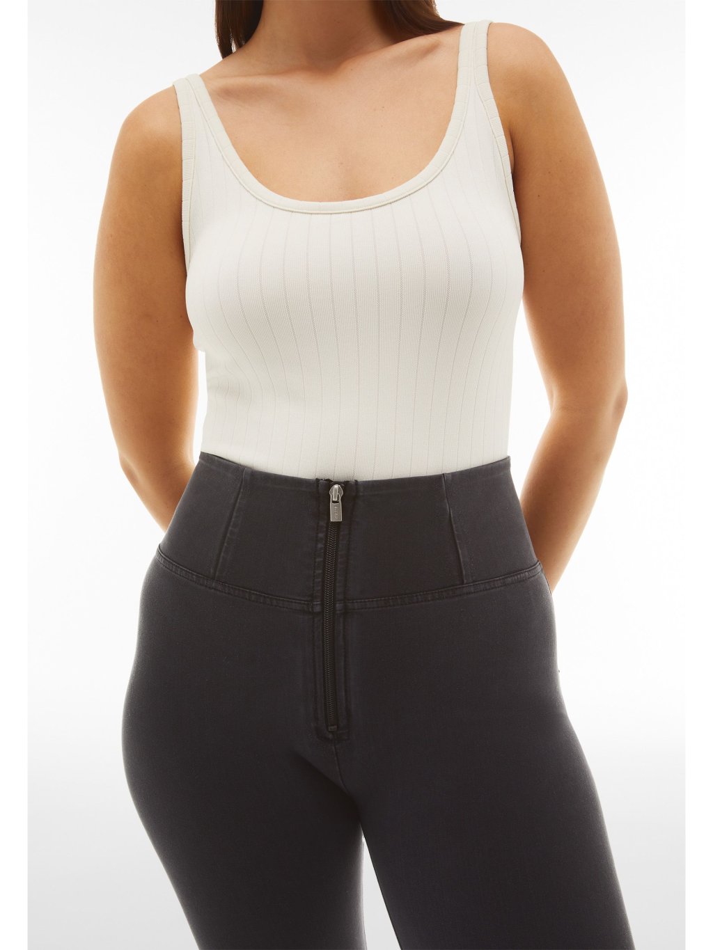 - Vysoký pas (High waist) - kalhoty jsou až do pasu ( k pupíku). Mají pouze zip, který je vidět. Nemají poutka na pásek a silikonový proužek v pase.