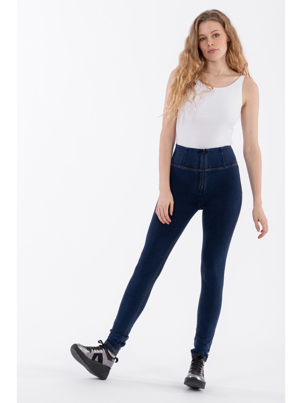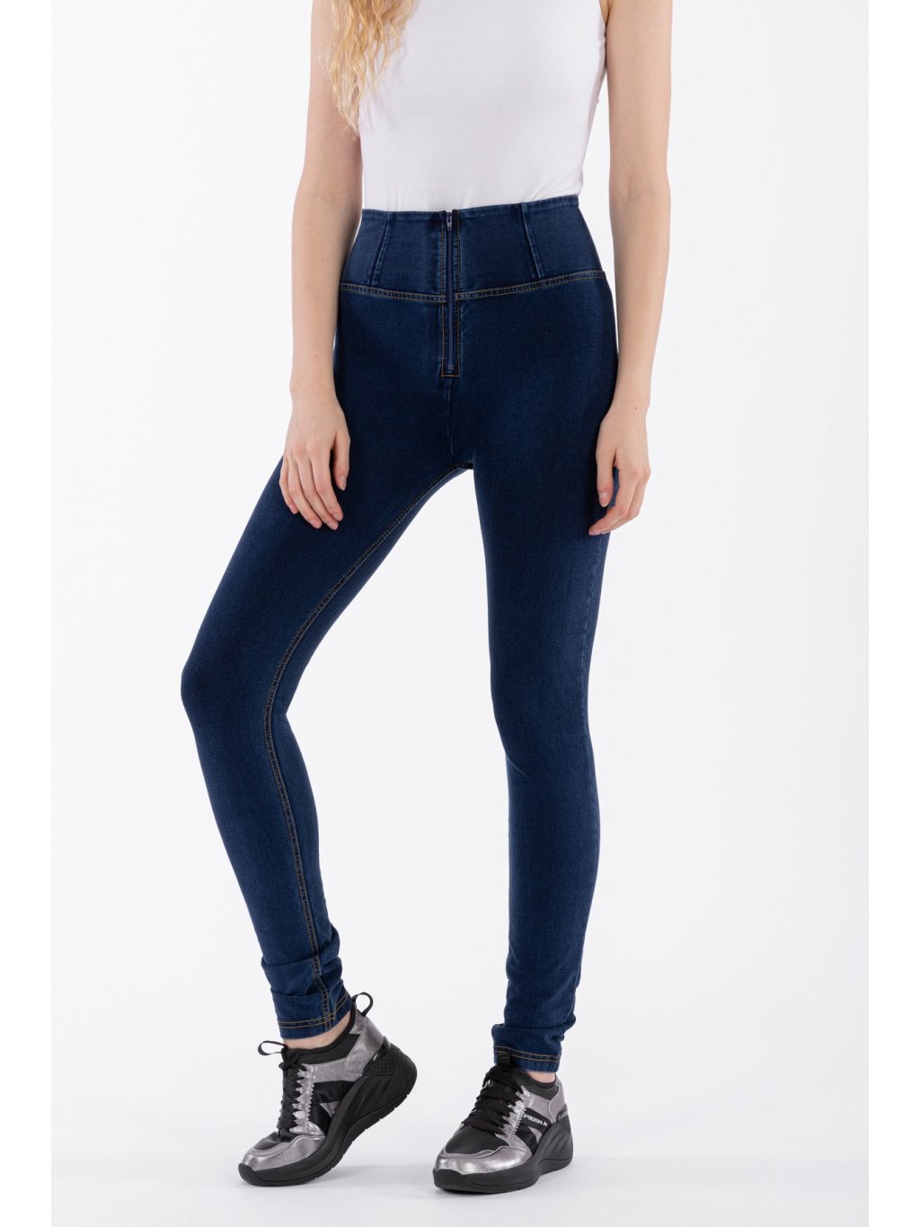 - Vysoký pas (High waist) - kalhoty jsou až do pasu ( k pupíku). Mají pouze zip, který je vidět. Nemají poutka na pásek a silikonový proužek v pase.
