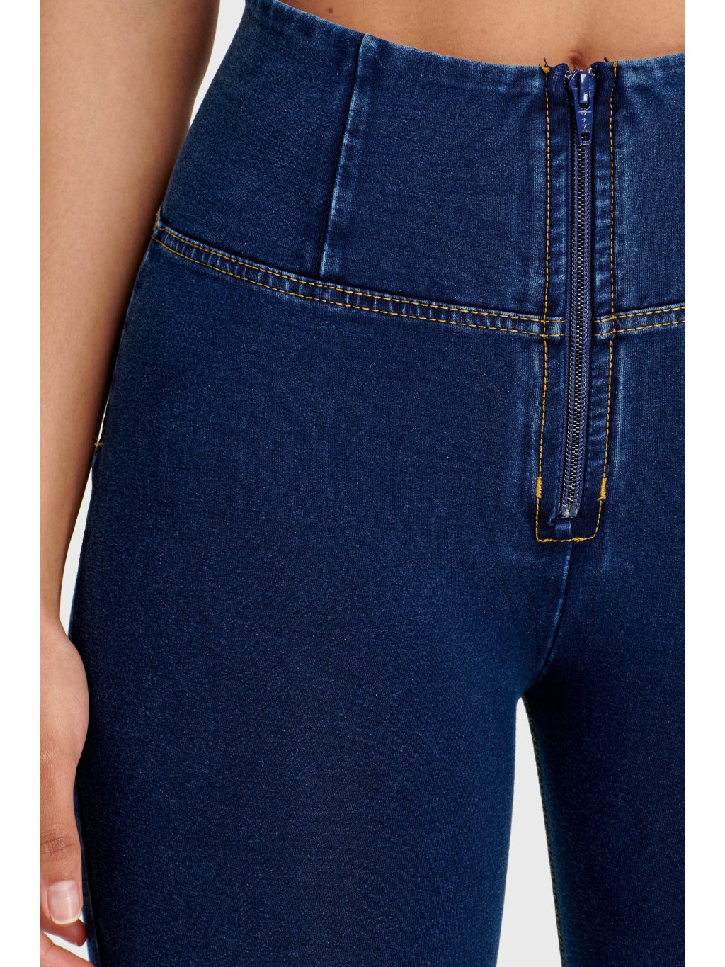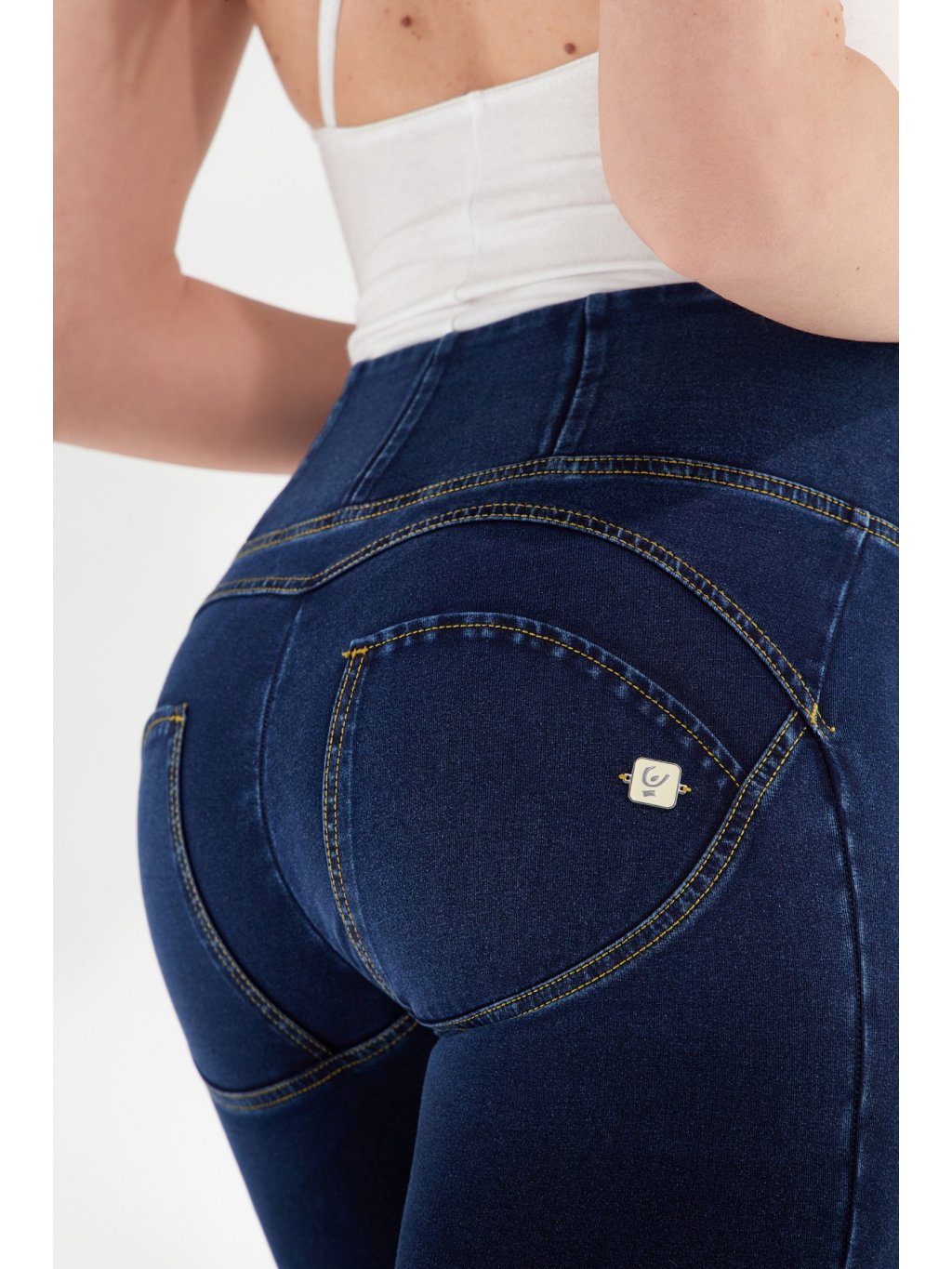 Freddy kalhoty v tmavě modré džínové, žlutý šev, vysoký pas, superskinny střih, 7/8 délka
