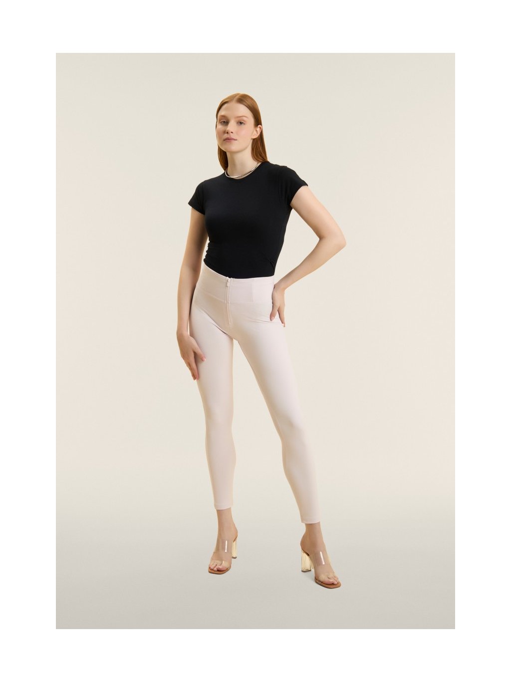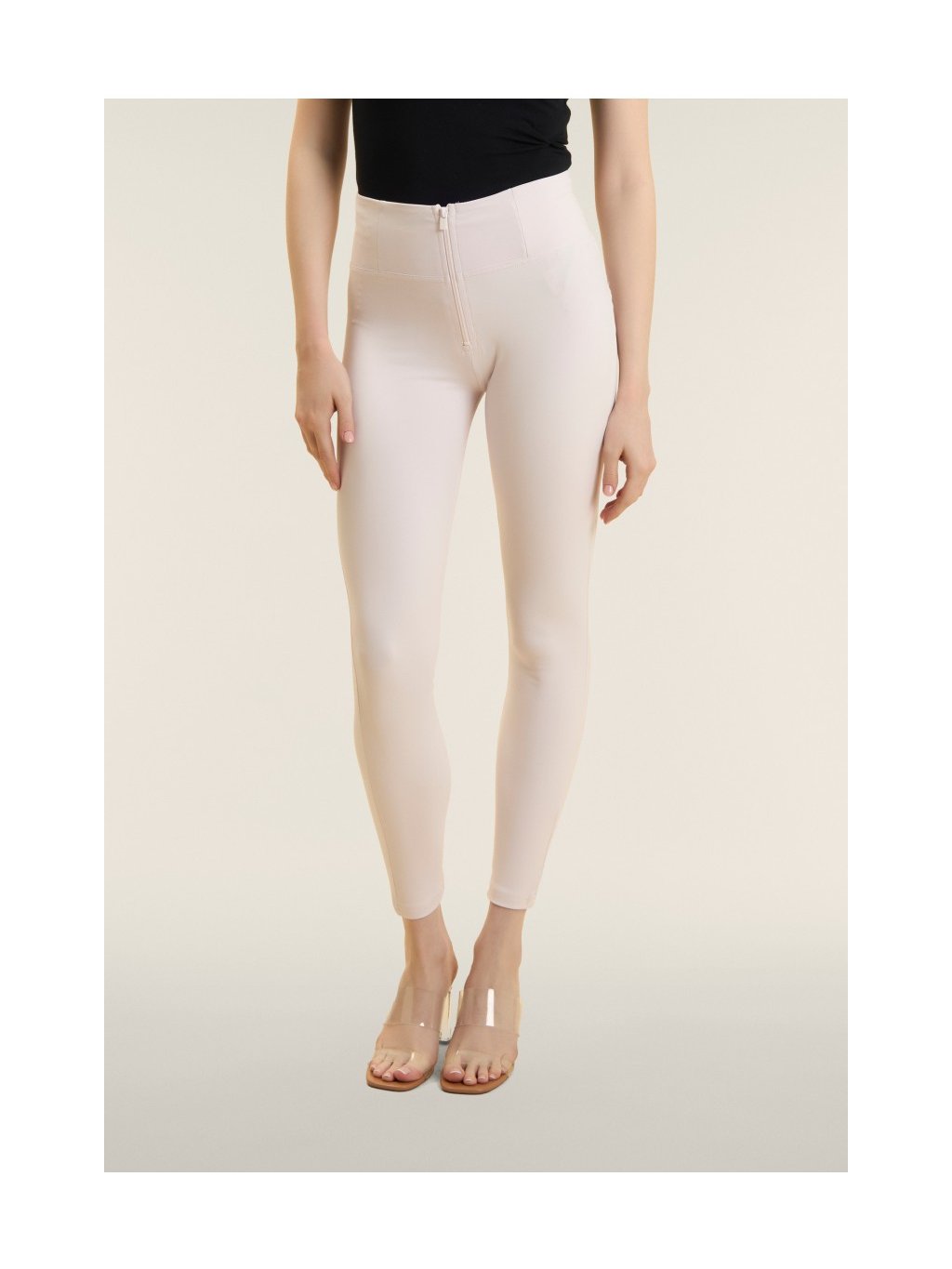 - Vysoký pas (High waist) - kalhoty jsou až do pasu ( k pupíku). Mají pouze zip, který je vidět. Nemají poutka na pásek a silikonový proužek v pase.