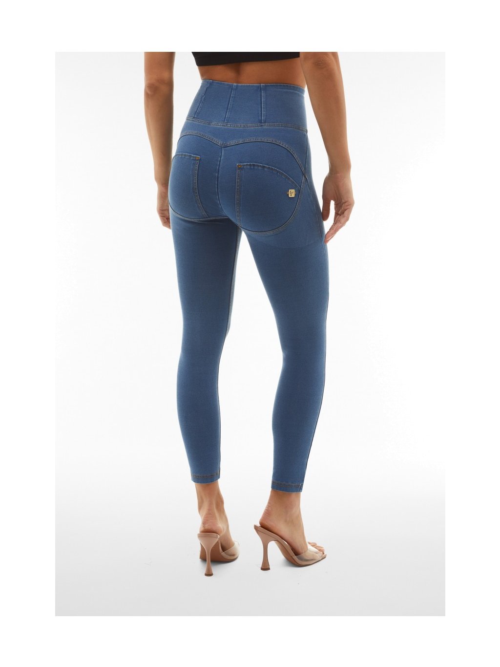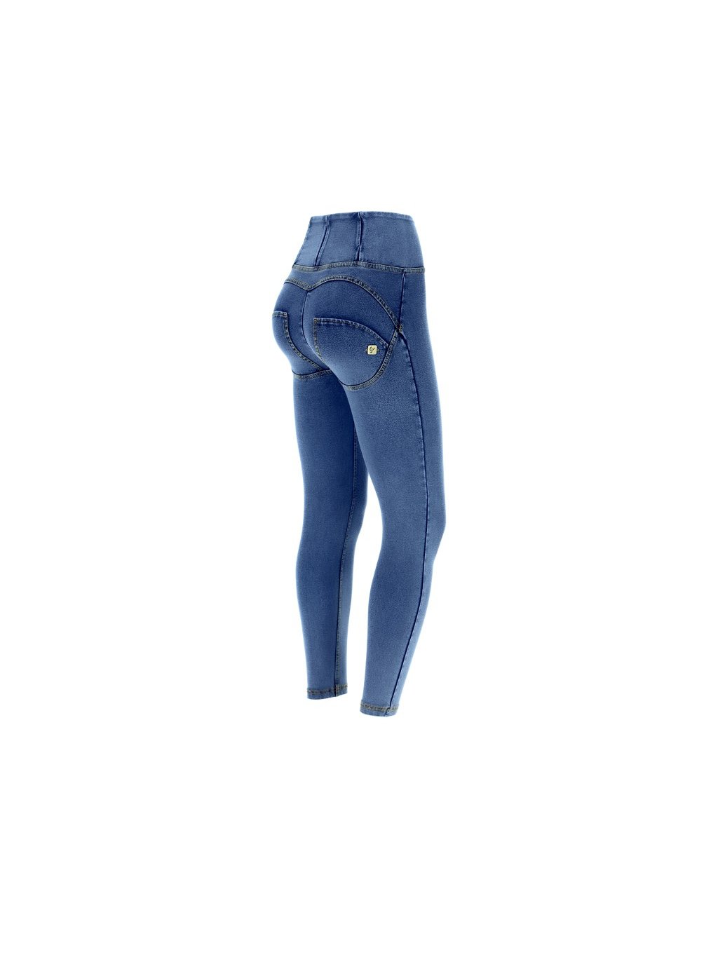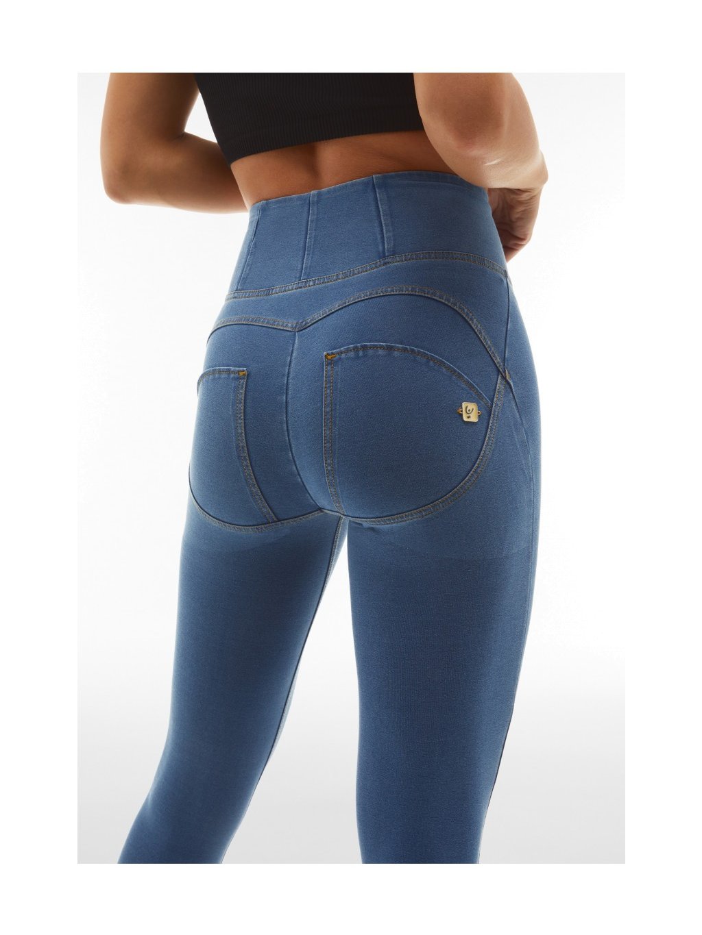Freddy kalhoty WR.UP ® v džínově světle modré, žluté švy, vysoký pas, superskinny střih, 7/8 délka, denim žerzej