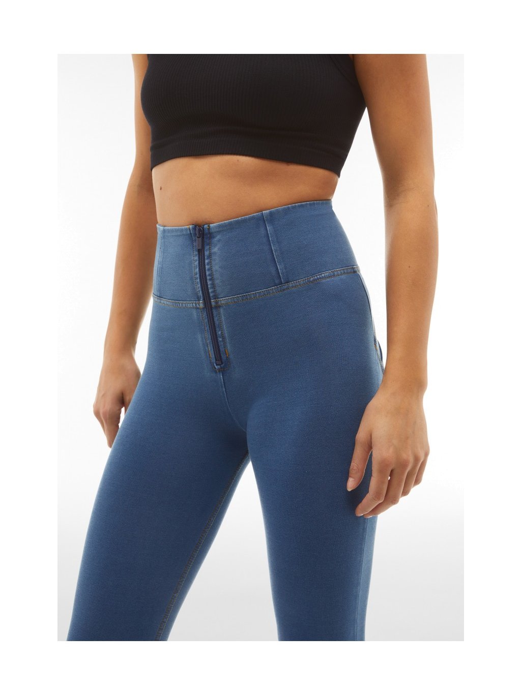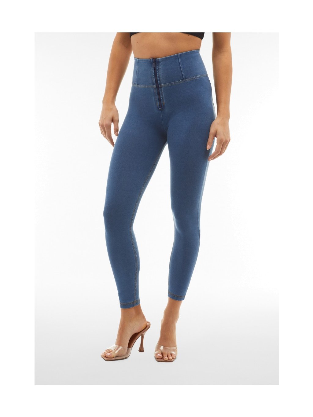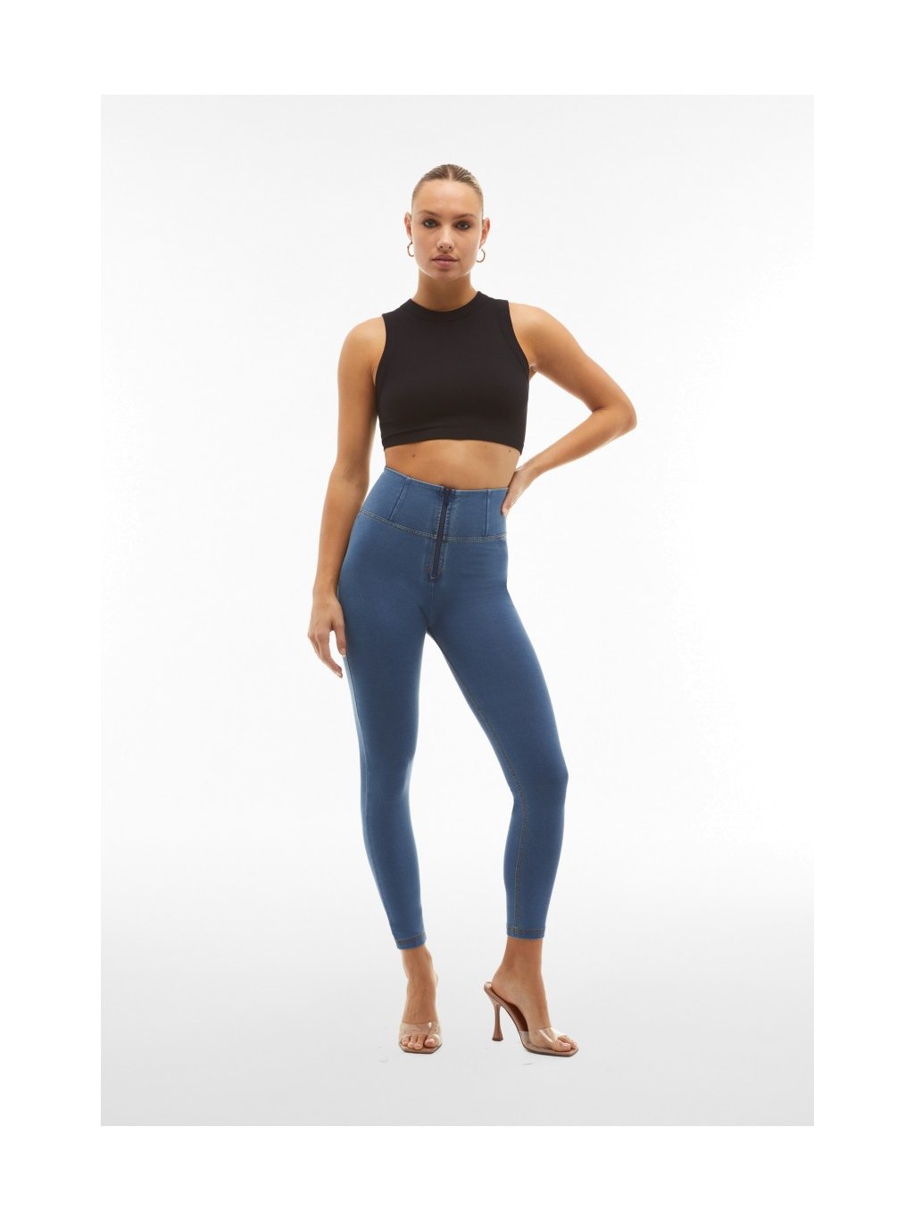 Freddy kalhoty WR.UP ® v džínově světle modré, žluté švy, vysoký pas, superskinny střih, 7/8 délka, denim žerzej