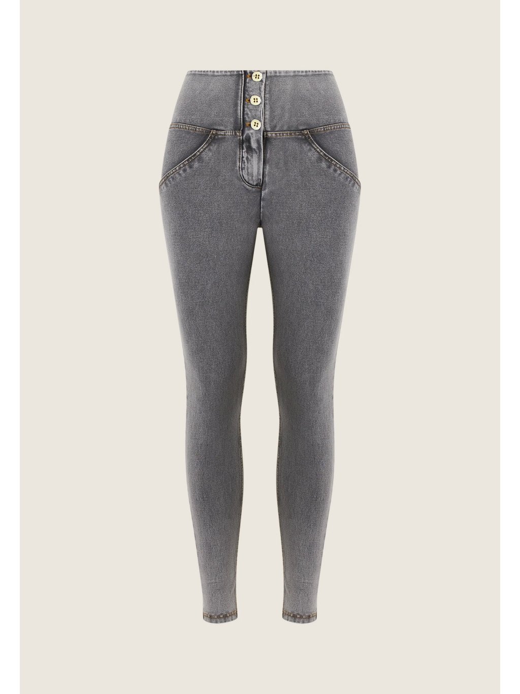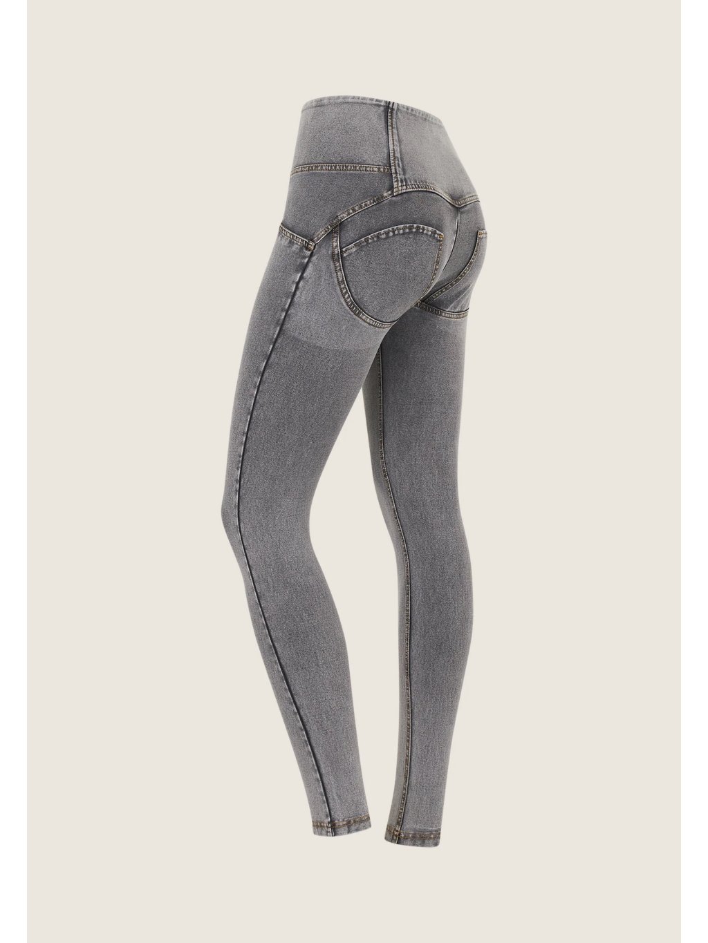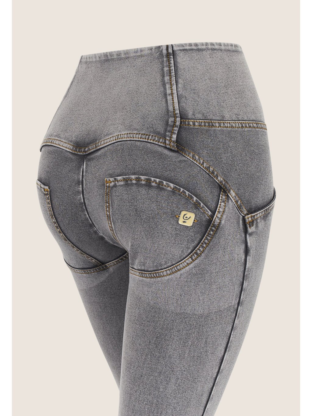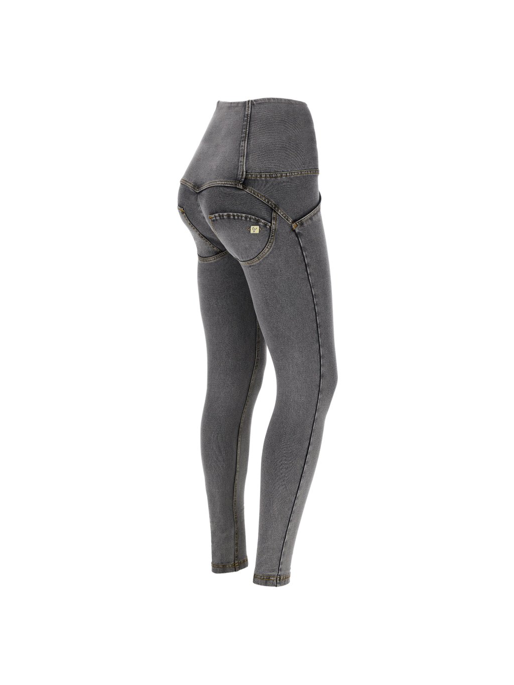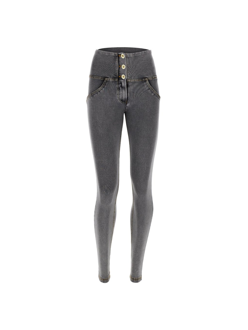 Freddy kalhoty WR.UP ® v džínově šedivé, žlutý šev, vysoký pas na knoflíčky, superskinny střih, denim žerzej