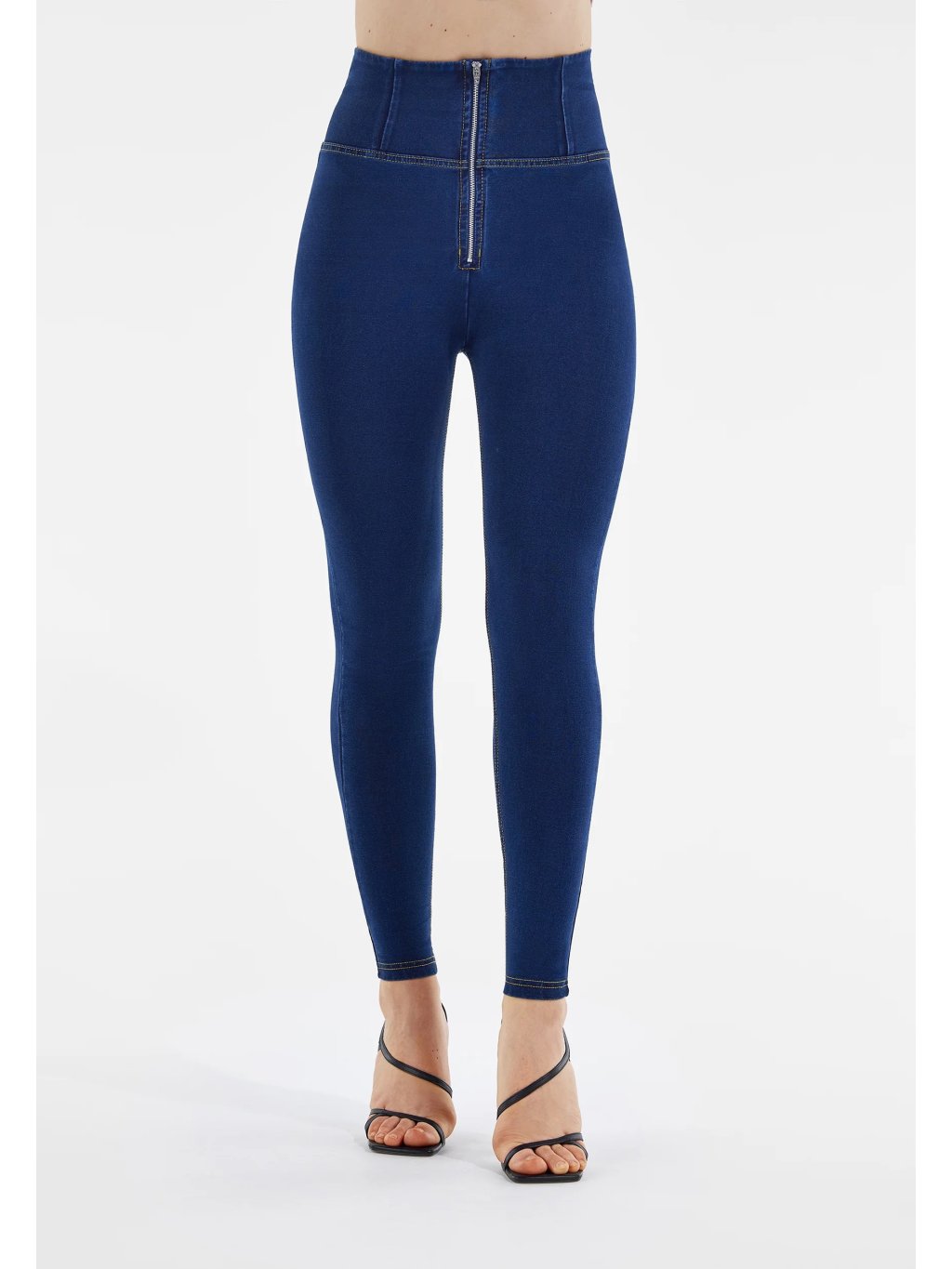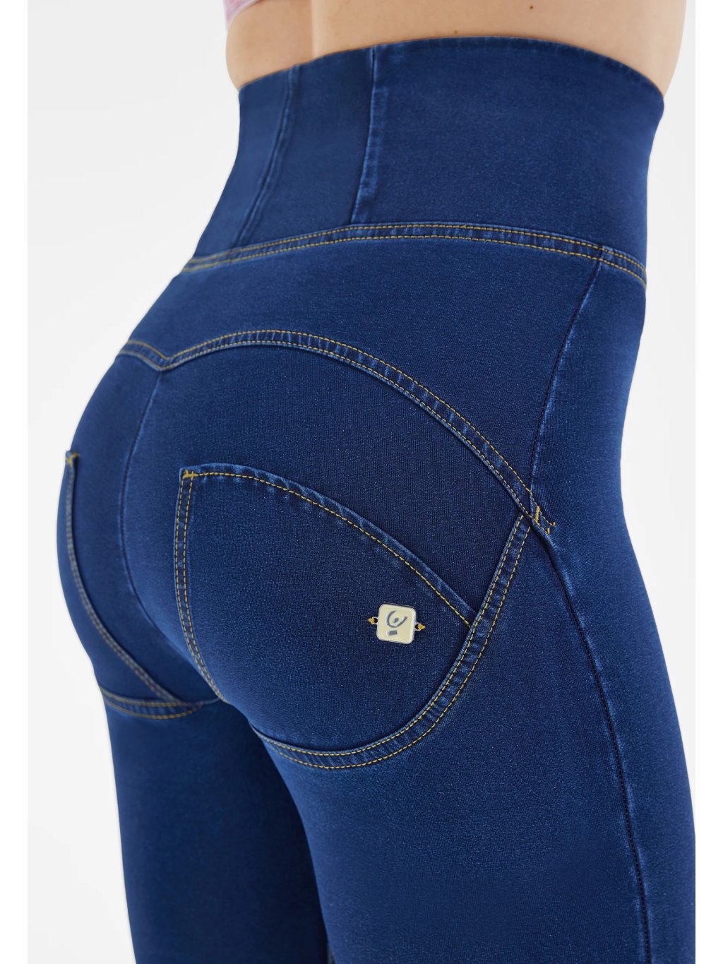 Freddy kalhoty WR.UP džínové modré, žluté švy, extra vysoký pas, superskinny střih, denim žerzej