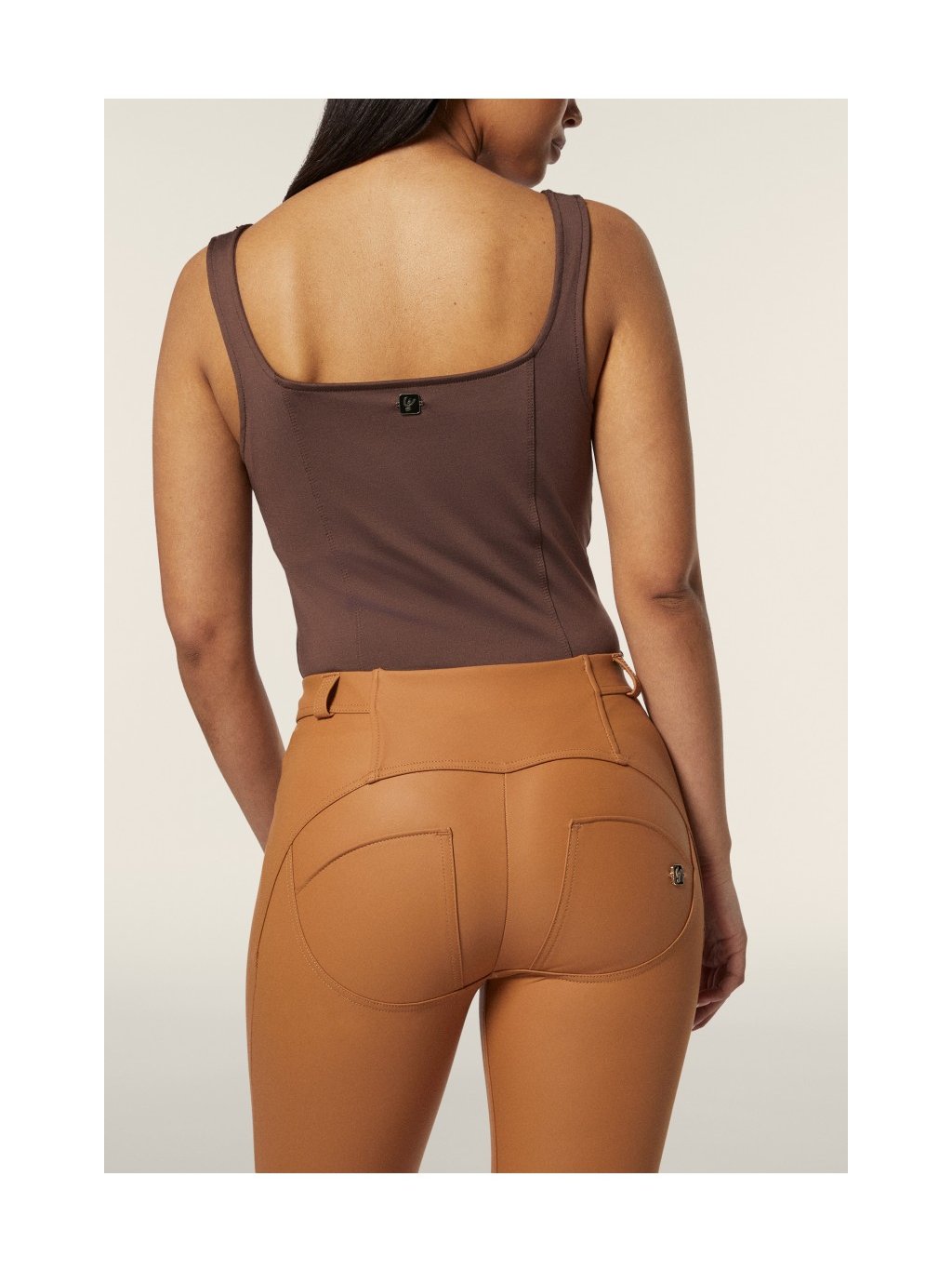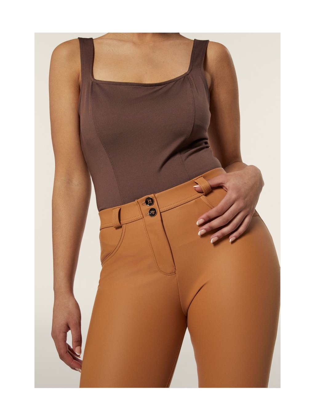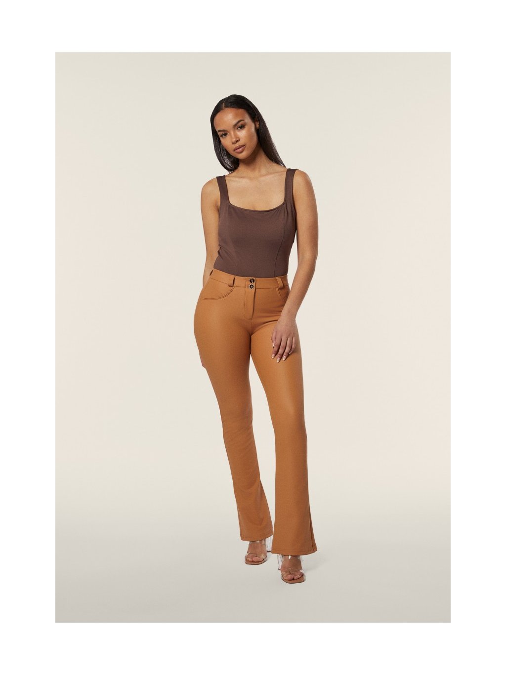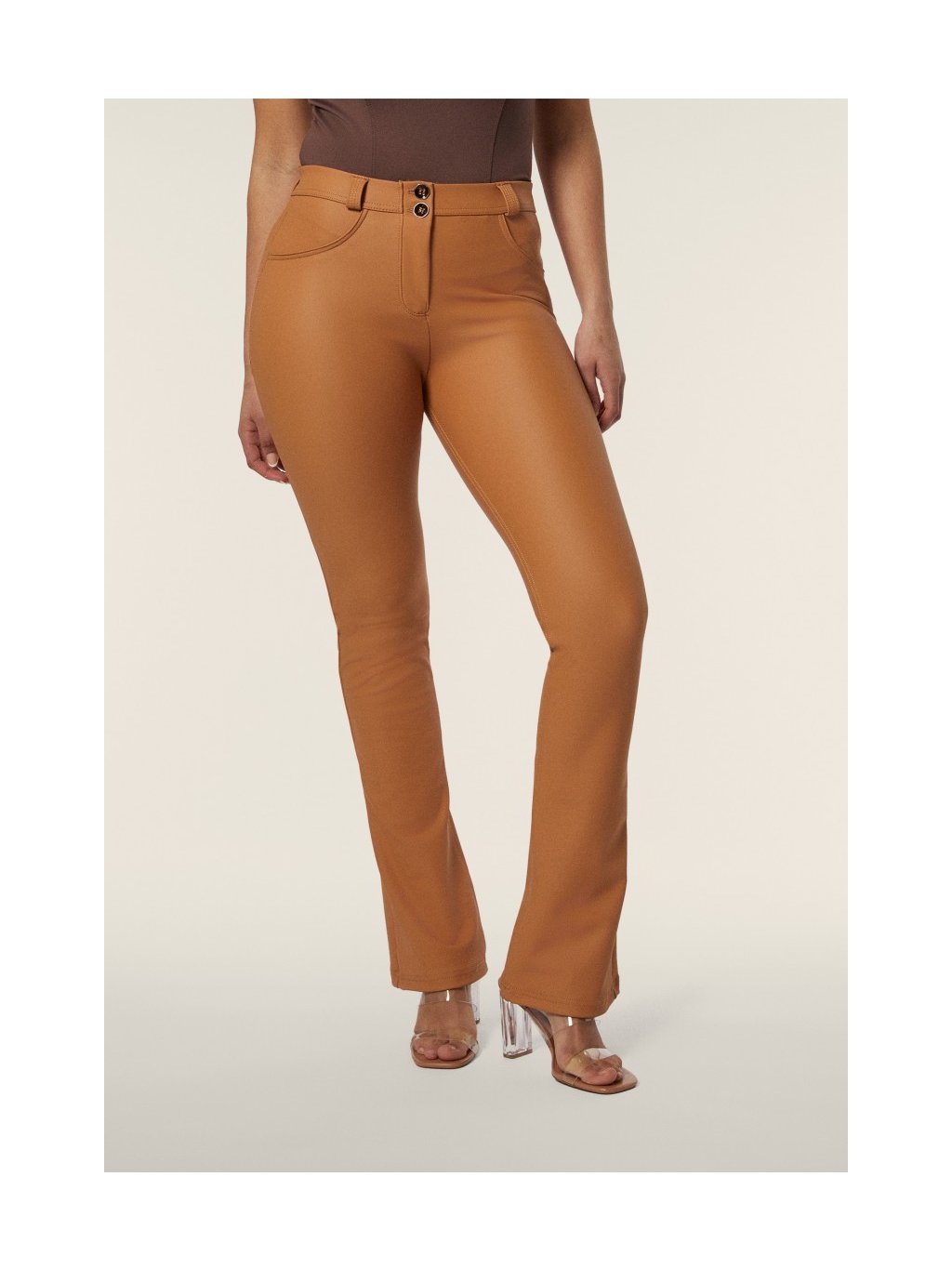 Freddy WR.UP. kalhoty v cihlové barvě, koženkové, normální pas, zvonové nohavice