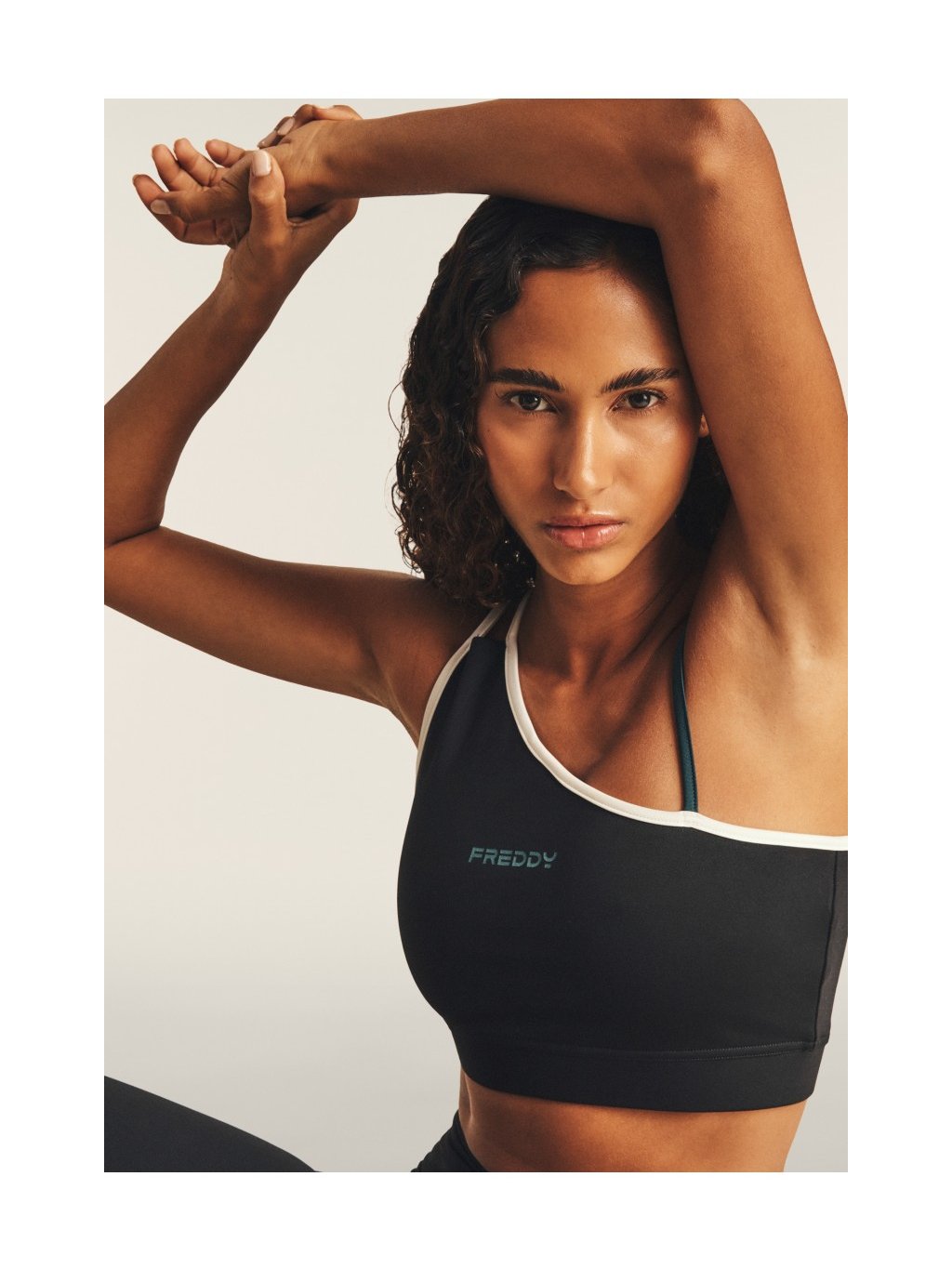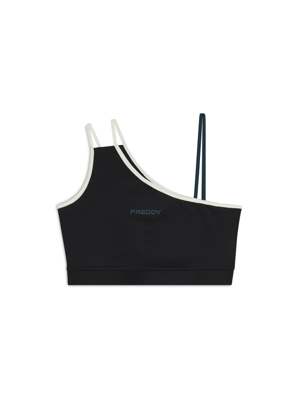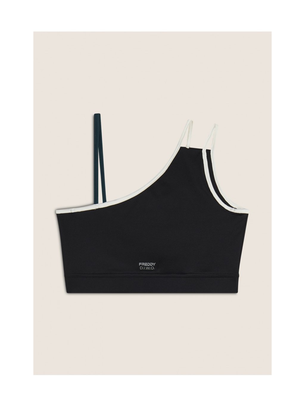 Jednoramenní top s výrazným a moderním designem, ideální pro ty, kteří hledají styl i lehké pohodlí. Je vyroben z funkčního materiálu D.I.W.O.®, který podporuje odvod potu a pomáhá udržet pokožku suchou během fyzické aktivity. Kontrastní ramínka dodávají modelu osobitý charakter, zatímco třpytivé logo FREDDY umístěné pod výstřihem v barvě ramínka přidává jasný a sofistikovaný detail. Logo potvrzující použití materiálu D.I.W.O.® na zadním lemu garantuje kvalitu tohoto kousku, který je ideální jak na trénink, tak i na volný čas.