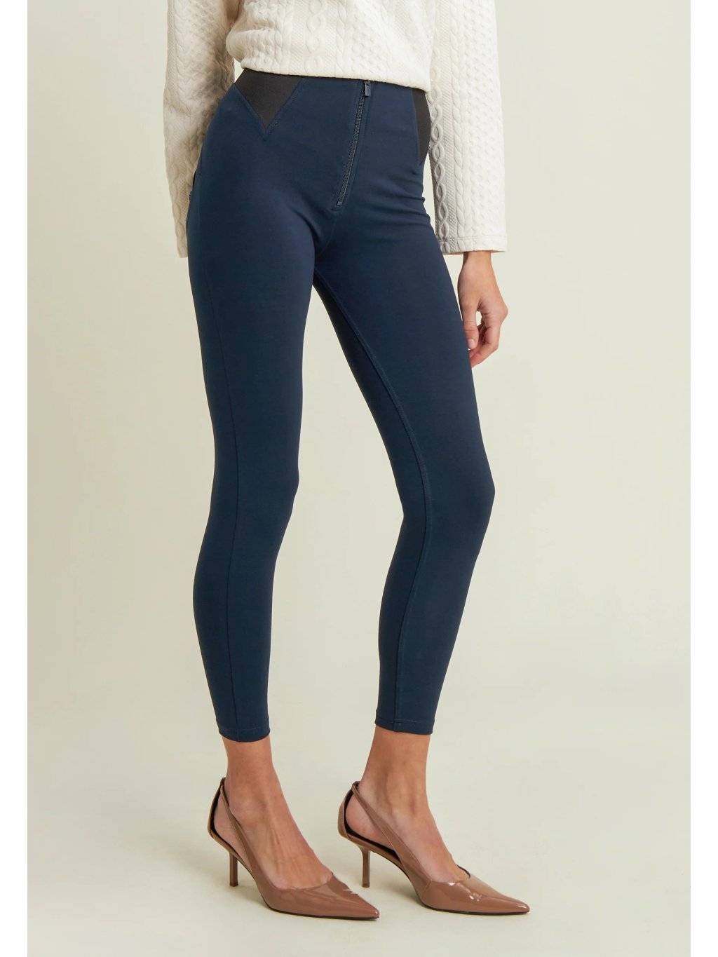 Freddy dámské kalhoty WR.UP® s vysokým pasem ve stylu, tmavě modré barvě, v pase guma černá, superskinny, 7/8 délka