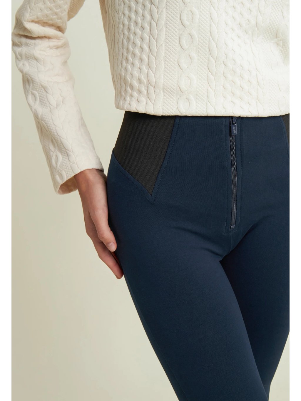 • Vysoký pas (High waist) - kalhoty jsou až do pasu ( k pupíku). Mají pouze zip, který je vidět. Nemají poutka na pásek a silikonový proužek v pase.